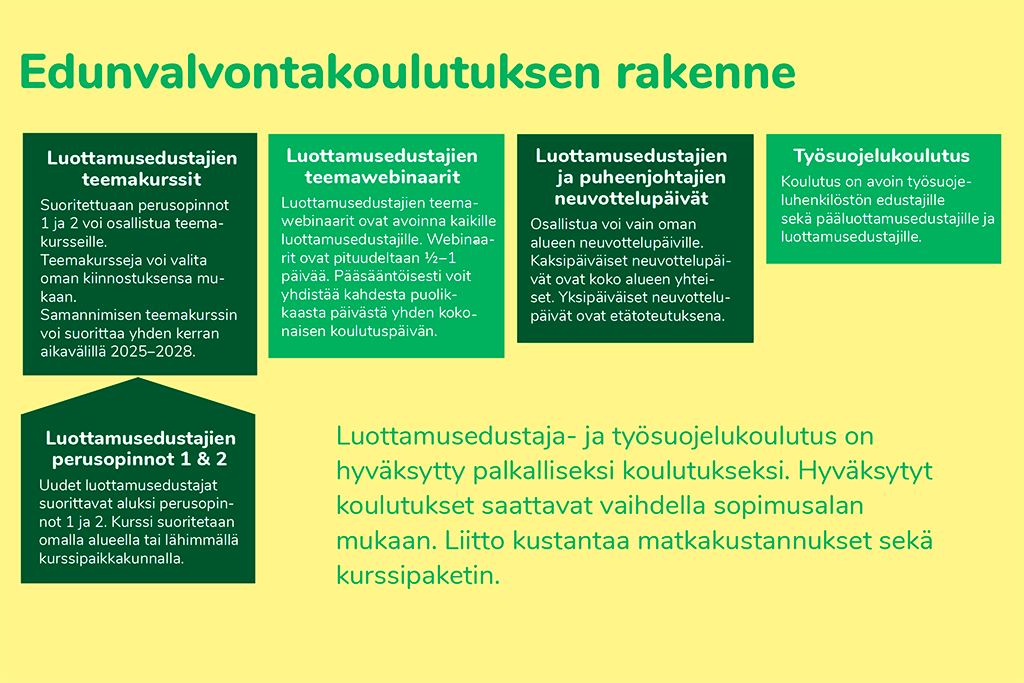 Järjestämme henkilöstön edustajille eli luottamusedustajille ja työsuojelun luottamustehtävissä oleville monipuolista koulutusta.
