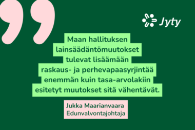 Pääministeri Orpon hallitusohjelma sisältää suuren määrän heikennyksiä työelämään, työntekijän oikeuksiin, lakko-oikeuteen, työsuhteen ehtoihin, työttömyysturvaan ja sosiaaliturvaan. Ammattiliitto Jyty vastustaa hallitusohjelman rajuja työelämäheikennyksiä, joihin voit tutustua tältä sivulta.
