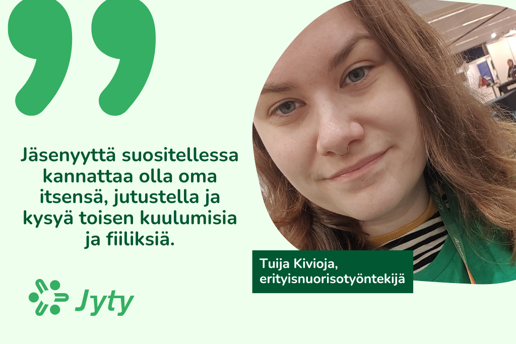 Kivioja mainosti jäsenyyttä suositellessaan Jytyn monipuolisia jäsenetuja sekä jäsenyyden helppoutta. Kuukausittainen jäsenmaksu on suhteellisen pieni etuihin nähden, ja työnantajaperinnän ansiosta maksu menee automaattisesti palkasta.