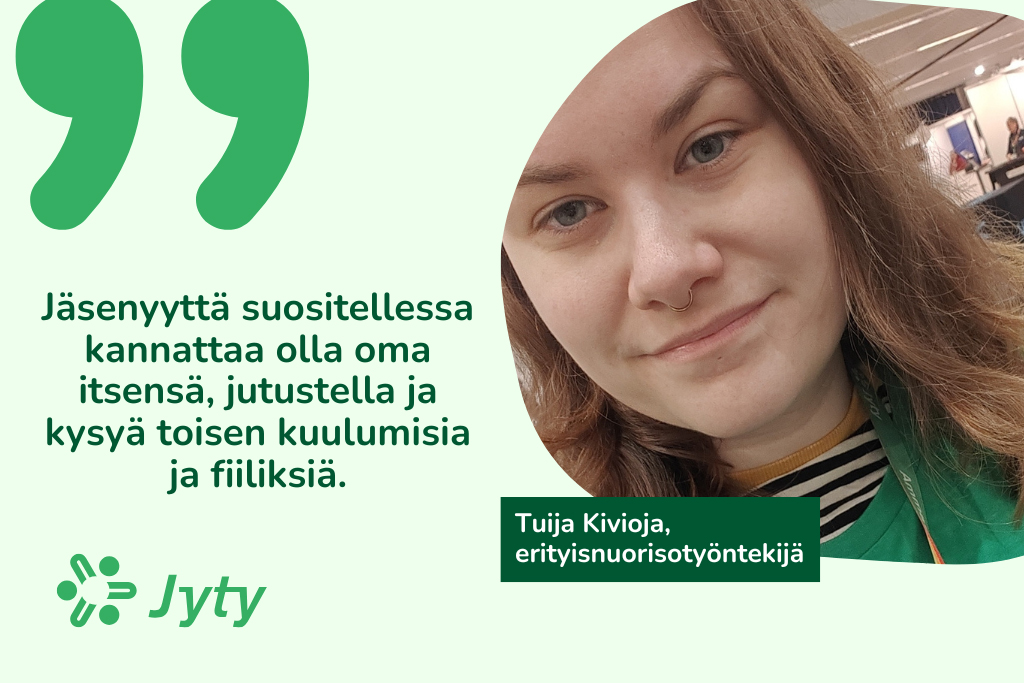 800 pisteen jäsenhankintapottiin on yltänyt myös jytyläinen erityisnuorisotyöntekijä Tuija Kivioja Kouvolasta. Itsekin vasta reilu vuosi sitten Jytyyn liittynyt Kivioja, 26, onnistui päättyneellä jäsenhankintakaudella houkuttelemaan liittoon 10 uutta jäsentä.