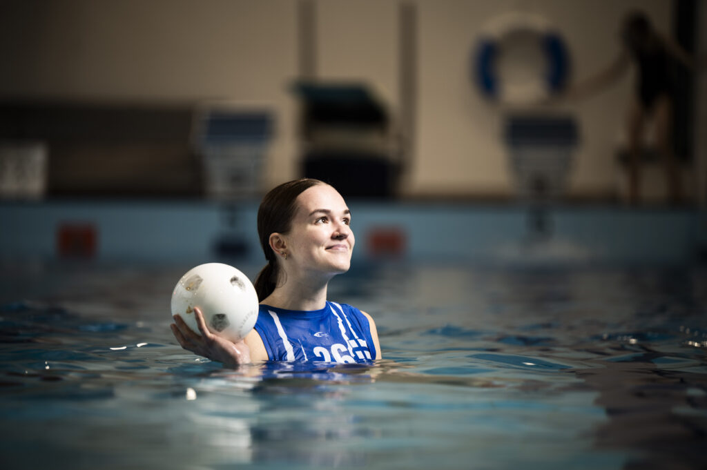 Jytyn tulevaisuustyöryhmän varapuheenjohtaja Niina Jurva harrastaa uppopalloa Rovaniemen uimahallilla.