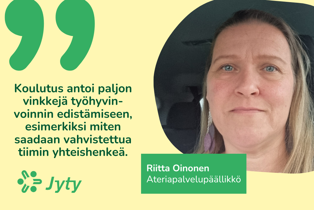 Ateriapalvelupäällikkö Riitta Oinonen Keravan kaupungilta osallistui Jytyn järjestämään Työhyvinvointikortti-koulutukseen marraskuussa. Oinonen toimii omassa työssään lähiesihenkilönä pienelle asiantuntijatiimille. Lisäksi hän on yhdistyksessään Jyty Keski-Uusimaassa sihteerinä ja pääluottamusedustajana.