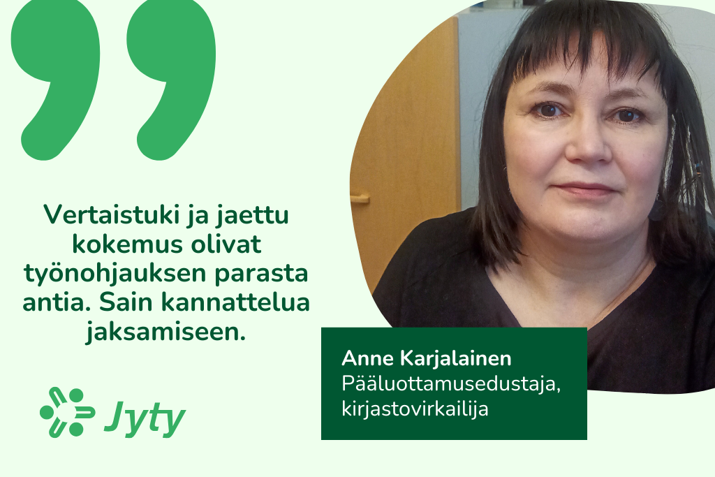 Karjalainen työskentelee kahtena päivänä viikosta kirjastovirkailijana, ja kolme päivää on varattu pääluottamusedustajan tehtäviin. Edustettavia jytyläisiä hänellä on reilut 250, ja uusia on tullut työllisyyspalveluista.
