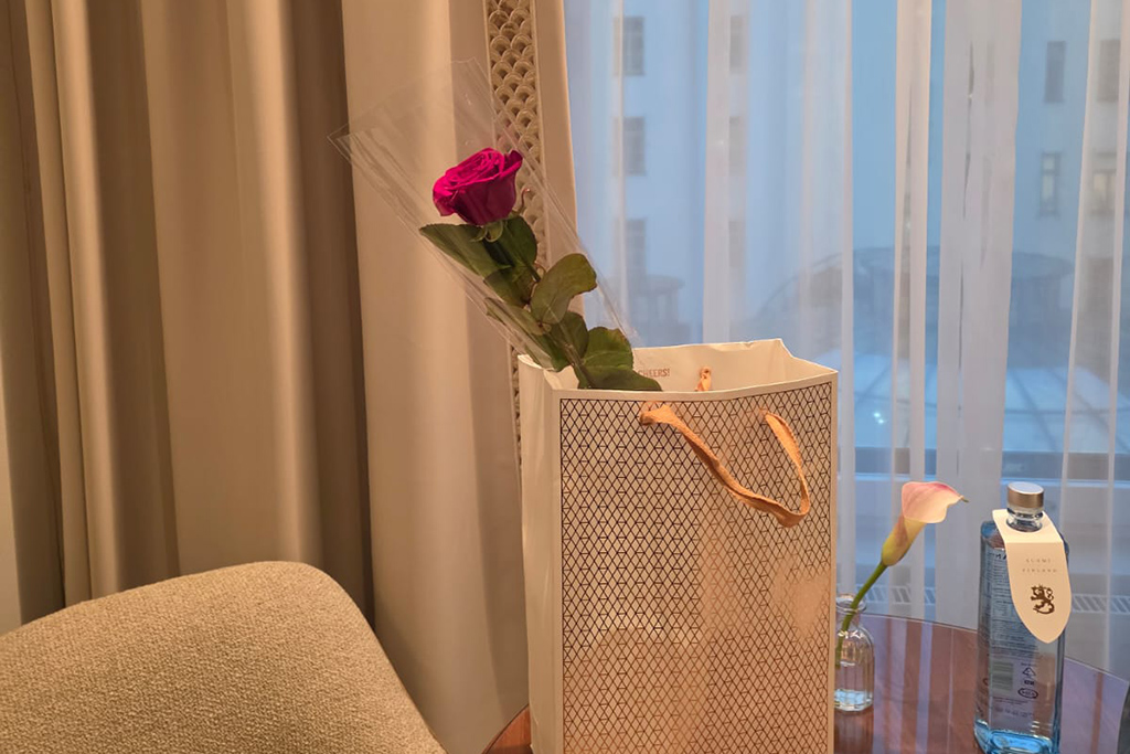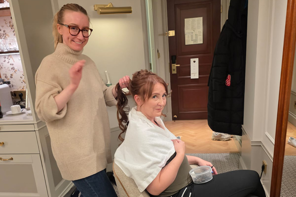 – Kampaajani sattui olemaan itsenäisyyspäiväviikonloppuna Helsingissä koiranäyttelyssä. Hän tarjoutui tulemaan hotellille tekemään kampauksen, josta tulikin todella upea hiuslisäkkeineen päivineen, Mitts kertoo.